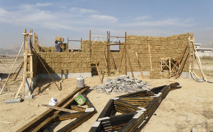 The frame is built, and with wood which will take the load of the roof. The strawbales will be fitted in-between the frame, so all they do is hold up their weight. The cost of this type of house is relatively high as compared to loadbearing. This type of structure allows us to use many doors and windows as compared to load-bearing walls in which we can have limited doors and windows.